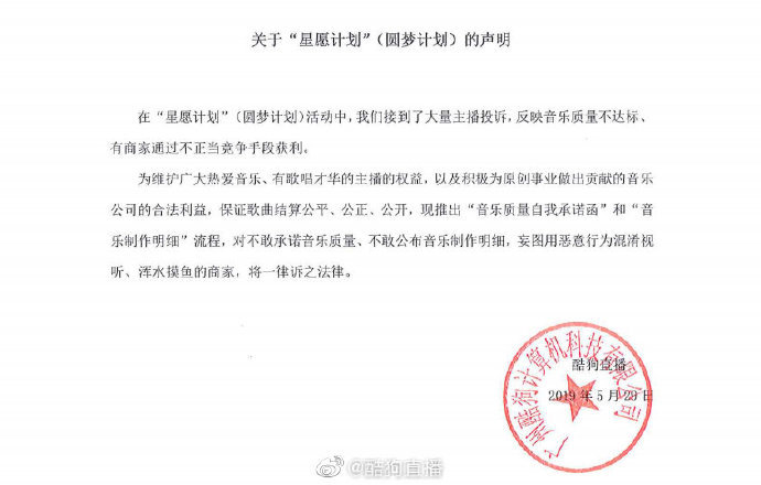 36氪讯,针对近期媒体报道的音乐人维权风波,酷狗直播官方微博发布声明称,在“星愿计划”(圆梦计划)活动中,接到了大量主播投诉,反映音乐质量不达标。酷狗直播表示,现推出“音乐质量自我承诺函”和“音乐制作明细”流程,对不敢承诺音乐质量、不敢公布音乐制作明细,妄图用恶意行为混淆视听、浑水摸鱼的商家,将一律诉之法律。