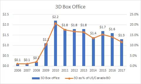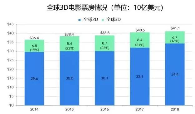 然而在近年来,全球多个地区的 3D 电影票房都开始了不同程度的下滑。去年全球 3D 电影票房为 67 亿美元,占全球票房 16%,较前一年下滑了 20%。其中北美地区的下滑 34%,亚太地区下滑 14%。