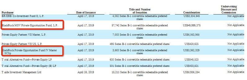而在瑞幸咖啡的招股书中,认购该公司股权的则为贝莱德旗下的私募基金BlackRock Private Opportunities Fund、BlackRock MD Private Oppotunitise Fund、BlackRock Inverwood Rrivate Opportunites Fund、BlackRock MSV Private Opportunities Foud。
