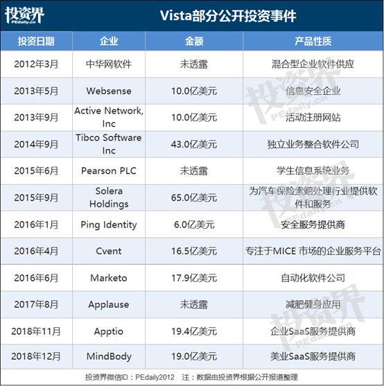 公开资料显示,2016年1月,Vista以6亿美元的价格收购了Ping Identity;同年6月,又以18亿美元的价格收购了Marketo;2017年,Vista还收购了苹果的企业设备管理公司Jamf。最近的一笔公开收购来自于2018月12月,Vista以约19亿美元的现金对其进行了收购,Mindbody Inc是一家帮助健身和瑜伽工作室运营的软件制造商,上市大约四年。