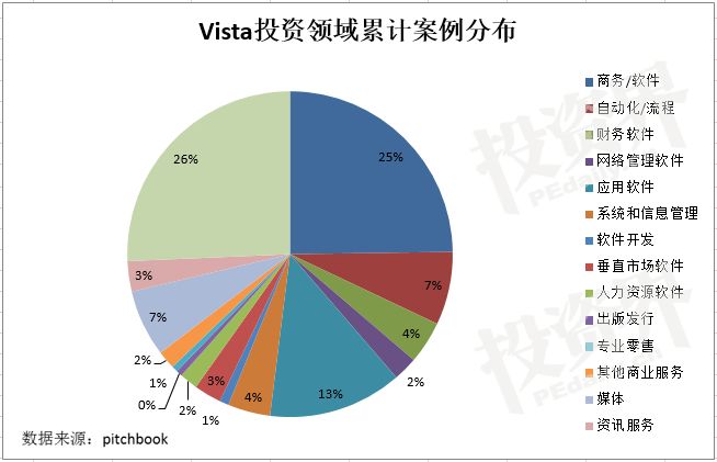 术业有专攻,Vista要做PE机构里最会投软件的那一家。纵观Vista的投资案例分布,软件总数共计204起,不难发现,软件领域中属商务/软件领域最受青睐,投资案例达到案例总数的25%。