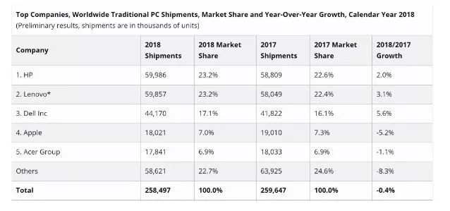 Gartner和IDC市场数据共同显示,2018年全球PC市场出货量连续第七年出现下滑。尽管Gartner和IDC在“全球PC出货量谁最高”这一问题上仍然存在分歧,但是毫无意外的,联想、惠普、戴尔三家2018年全球出货量均有所增长。