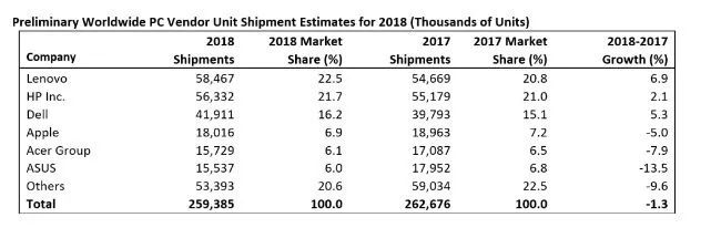 从数据上来看,2018年全球PC出货量持续下滑的主要原因是以宏碁、华硕为主的台系厂商和苹果的共同溃败。