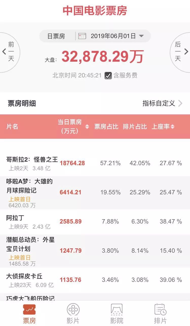 《哆啦A梦:大雄的月球探险记》手握“哆啦A梦”这样一个以情怀打底的经典动画IP,虽不敌昨日首映的由美国华纳影片公司和传奇影业联合出品的灾难巨制怪兽电影《哥斯拉2:怪兽之王》,但力压上映9天的迪士尼的爱情奇幻片《阿拉丁》及同为今日首映的国产电影《潜艇总动员:外星宝贝计划》,于今日的日票房排名第二,市场份额占比虽不及预期,仍近五成。
