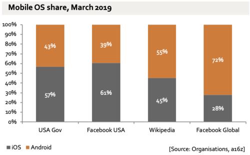上什么样的平台呢?平台之战很久以前及结束了,苹果和Google都是赢家(至少在中国以外)。然而,就像大家所预期那样,鉴于价格的范围,这些设备的分布并不均匀:美国的调查显示,超过80%的青少年拥有iPhone,而印度的情况恰恰相反。这些设备的使用也很重要:购买高端手机的人往往对手机的使用也更多。因此,下图给出的是有着大量流量的采样点的流量数据:你的客户在哪里呢?