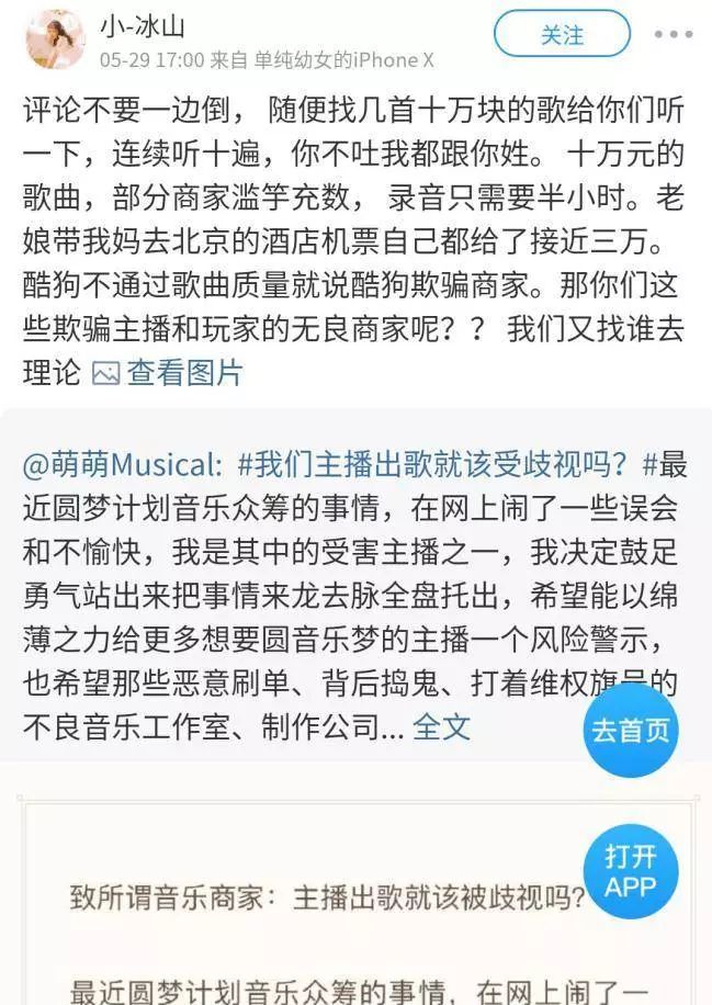 而一位名叫萌萌Musical的主播也在微博讲述了自己遭遇不良商家的经历,29日晚间,这位主播在微博发布了一篇千字长文,文中直指自己通过“星愿计划”录制单曲时,商家在录音过程中存在敷衍了事,成品与DEMO(小样)效果相距甚远,当自己提出质疑还被商家不良态度对待的情况,文尾更是将矛头指向“为什么主播录歌就该受人歧视”。