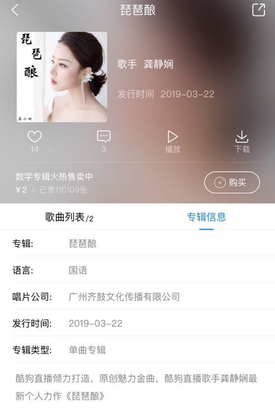 小梦不满的是,自己为主播龚静娴创作的单曲《琵琶酿》,已经在酷狗平台通过付费下载售出了11万张,根据标价2块钱一张,仅这张专辑酷狗就收入版权费22万元,而她创作的其他单曲如《自圆其说》《调味巧克力》等也均在酷狗音乐上陆续在出售。