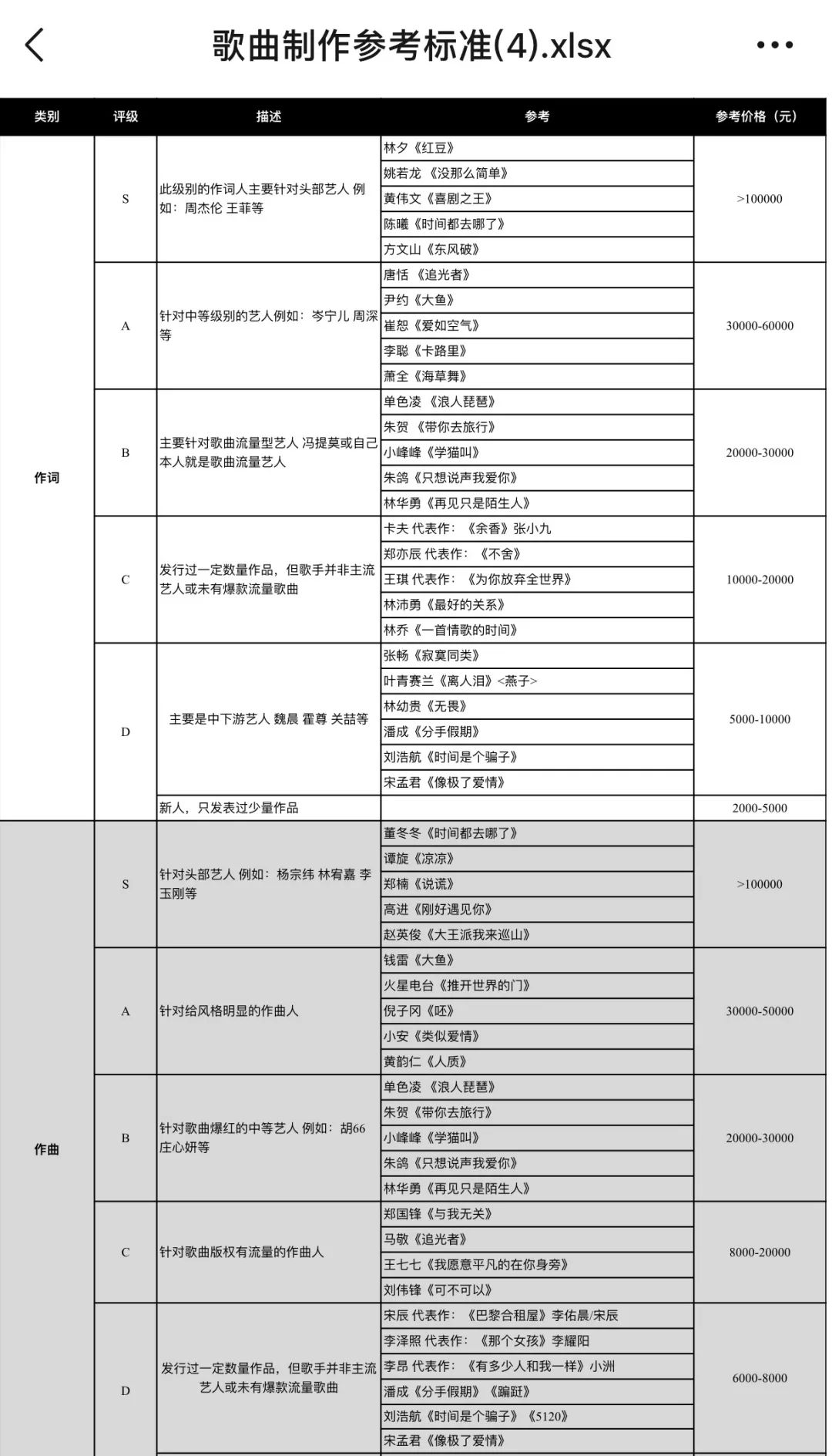 在李中胜给娱乐资本论看的一份酷狗给出的“歌曲制作参考标准”中,规定了艺人按照不同咖位,作词作曲乐器混音都可以分为S,A,B,C,D几个等级,都分别有着不同的参考价格。例如在下表中,林夕级别的作词人,给王菲写一首《红豆》的歌词价格,酷狗给出的参考价是大于10万,这属于头部艺人价格,而刚出道的新人,写一首词的参考价格只有2000—5000元。