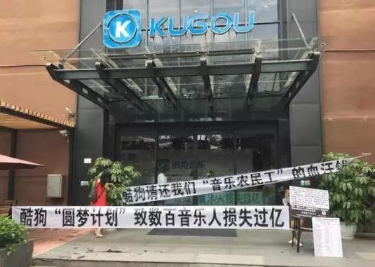 横幅的口气颇为惊悚:“酷狗,请还我们‘音乐农民工’的血汗钱!”