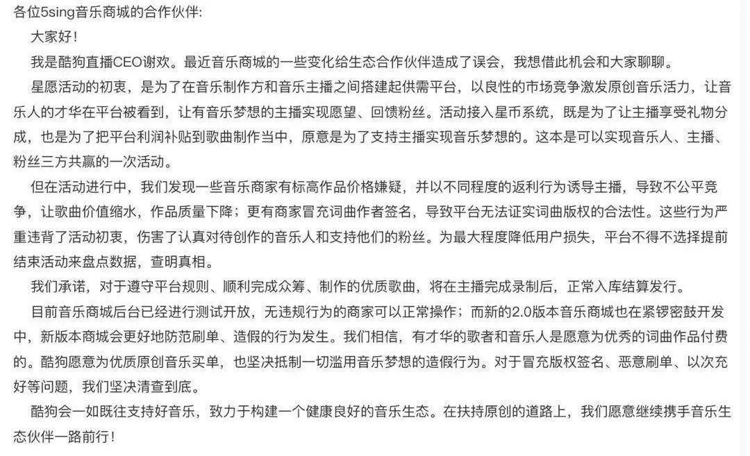 酷狗直播CEO谢欢的一封公开信透露了不少问题——音乐商家标高作品价格、用返利诱导主播参与,歌曲价值缩水,甚至,冒充词曲作者签名。