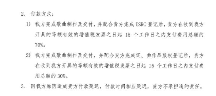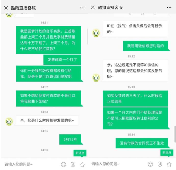 一位名叫小梦的音乐人对娱乐资本论说,自己目前为酷狗制作的7首歌,包括已经上架的5首和待审核的2首,均没有收到酷狗的一分钱打款。而在原合同约定的流程中,在通过审核并递交发票的15个工作日内,酷狗就应该支付70%的制作首款费用。