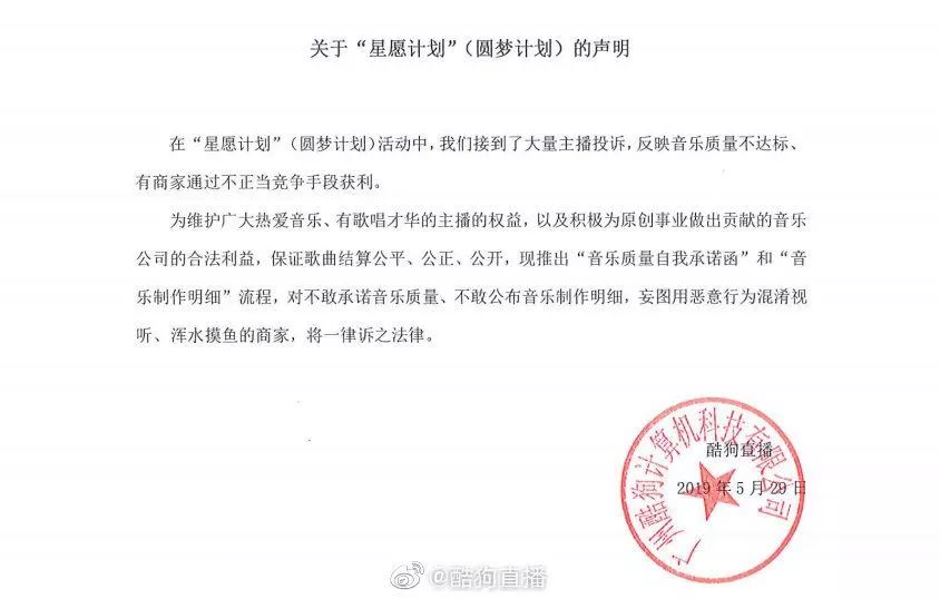 但随后,5月29日下午,酷狗音乐发布官方声明,指出在“星愿计划”活动中接到了大量主播投诉,反映单曲的音乐质量不达标,更有商家通过不正当竞争获利。