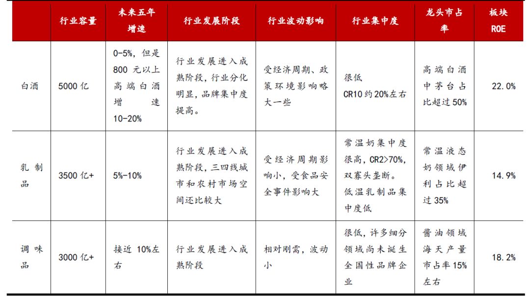 图4:调味品、乳制品与白酒行业增长与格局的对比分析