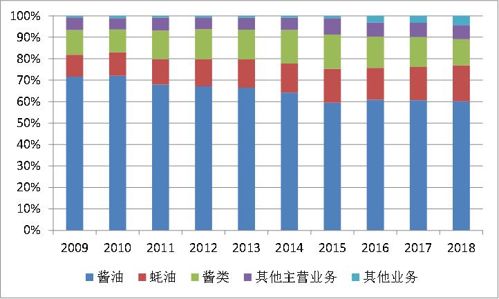 2009年,公司酱油收入占比高达72%,而到2018年,酱油贡献收入的比重下降到60%,同时耗油占比达到17%,酱料占比达到12%。