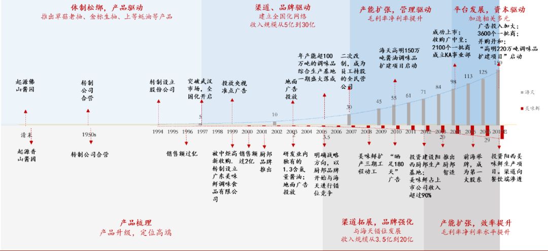 由于全文笔者在公司酱油上放了太多的笔墨,容易造成海天就只是一个做酱油的误解。其实公司是从酱油起步并积极壮大蚝油、调味酱两大品类,近几年还通过收购拓展腐乳、醋等品类,品类逐渐多元化。