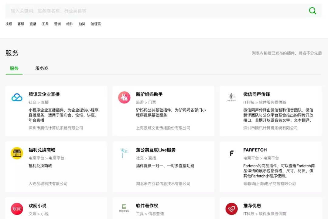 我们把眼光放回到微信开放平台。微信在今年3月底的时候,正式把原有的插件tab+服务商tab整合在了一起,统称为“服务平台”。这其实代表着一种态度,一种更开放的态度。