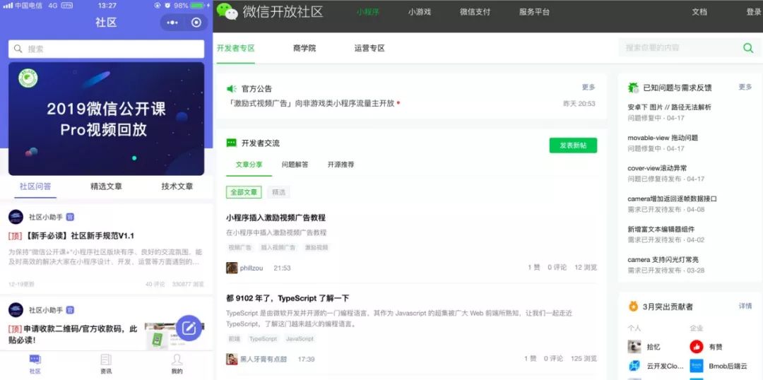 上面分别是微信端和PC端的微信开放社区。就不为大家一一分析都有什么模块和每个模块都代表什么了。但其中我们可以看到两大特性: