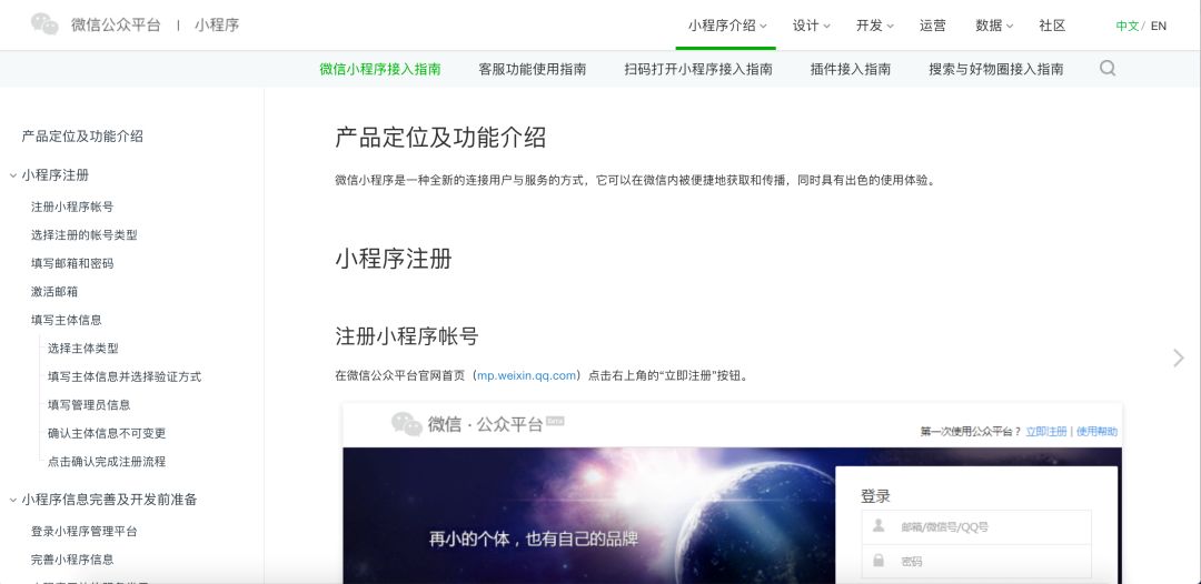 这就是小程序“官网”的主页面。很多开发者都是在这个页面上学习小程序的知识和流程,简洁、直接、高效。涵盖小程序的方方面面,能让开发者参照步骤学习。