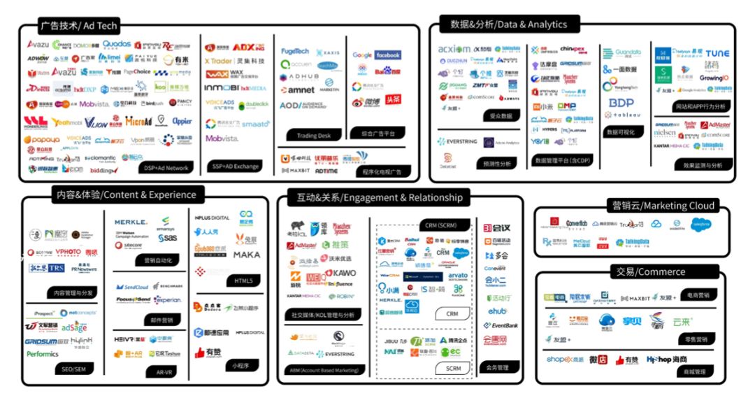 广告技术公司最多,内容体验和数据分析次之,营销云与自动化公司还很不成熟。