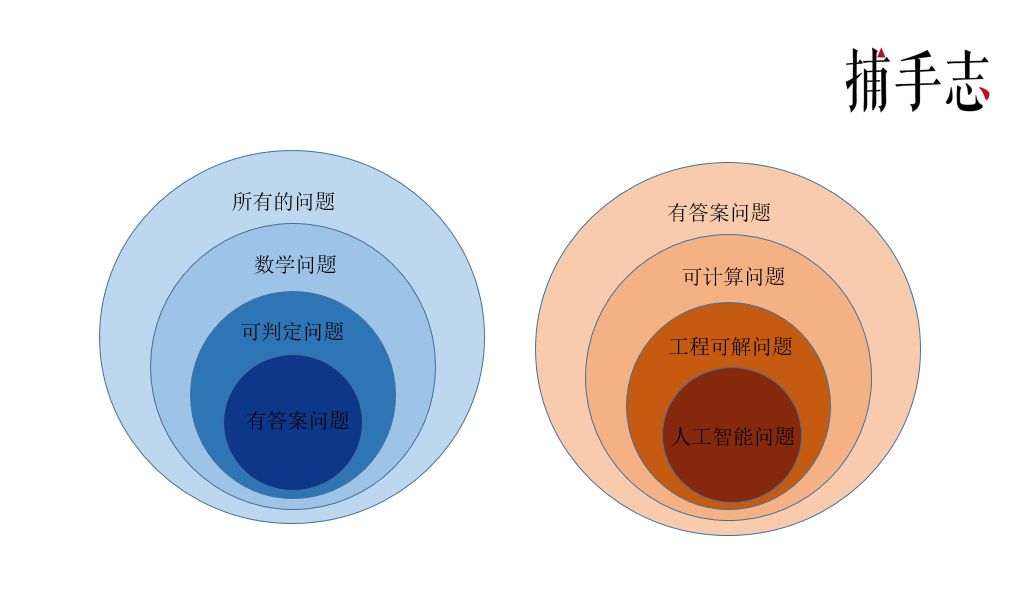 今天所有的计算机,无论多么复杂,都没有超出图灵机的范畴,解决的还是可计算的问题。当我们把世界上所有的问题和今天有答案的问题,做两张相互嵌套的图展示出来,你会发现,人类要解决的问题要比今天计算机能解决的问题多得多,而今天人工智能可以解决的问题又是少之又少的。