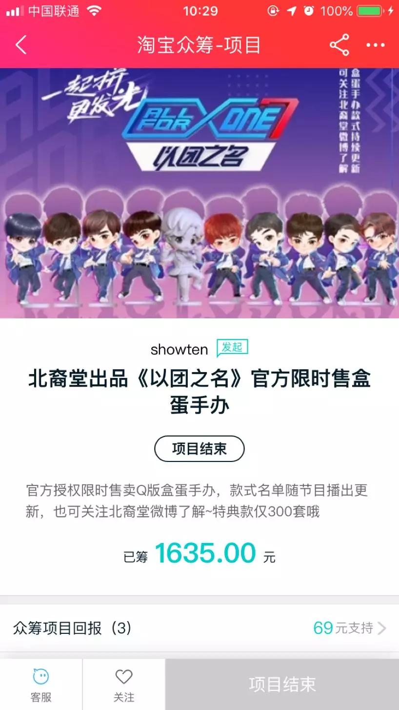 但大多数的综艺IP衍生品销量并不明朗,有些几个月的销量累计才上百出头,即便想依靠粉丝消费力加持,也未必能有很好地转化,例如北裔堂在淘宝上发起的《以团之名》限量手办众筹,原计划筹备10万金额做300套特典款,但截至项目结束,才筹到1635元。