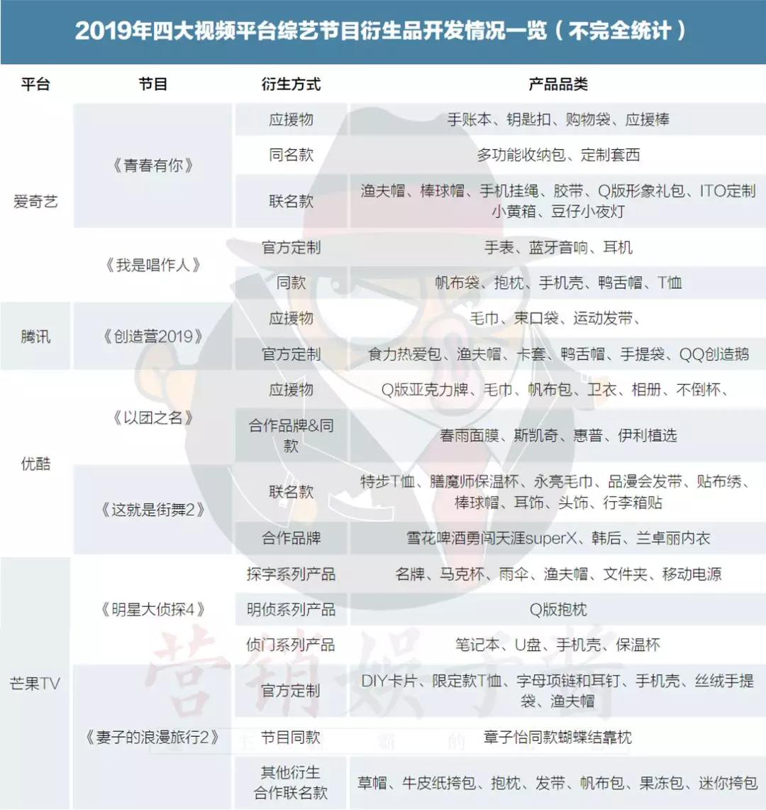 通过娱子酱的梳理不难发现,今年四大平台的头部自制综艺都在积极开发衍生品,且都以官方出售的节目周边产品为主。