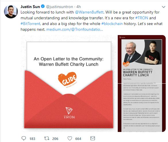 而孙宇晨显然是带着“教育巴菲特数字货币知识”这个使命拍下慈善午餐的。他在推特上称,期待与巴菲特共进午餐,这将是相互理解和知识互换的绝佳机会。不仅是波场币和其去年用1.2亿美元收购的文件分享应用软件BitTorrent的新时代,也将是整个区块链历史的重要一步,“让我们看看接下来会发生什么。”