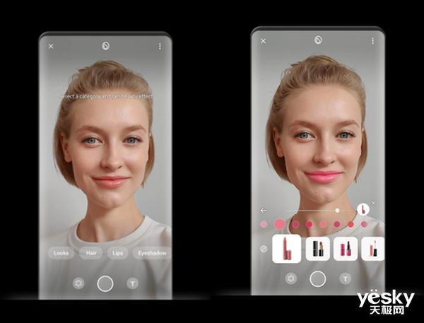 三星 Galaxy S10 的 Bixby 中加入了AR体验功能。用户可以选择选择整体的化妆效果,或者双唇、脸颊、眼影、眉毛、眼线笔等单独位置进行试妆,可以选择多款产品不同颜色自由组合。