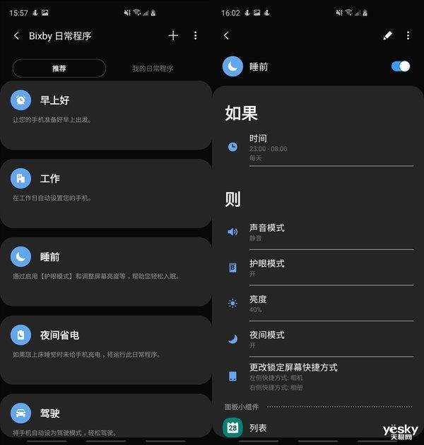 不少白领或商务人士每天要处理很多重复性的工作,在不同的工作场合要将手机调整至不同的模式。而 Bixby 可以通过简单的设置让手机根据不同的场景自动执行相关的任务,无需再每次进行手动操作。用户可以根据自己的需求去自定义各种日常程序,设置不同的条件以及执行的各项动作,用计划来应对我们遇到的的变化。有些类似 IFTTT 的功能。