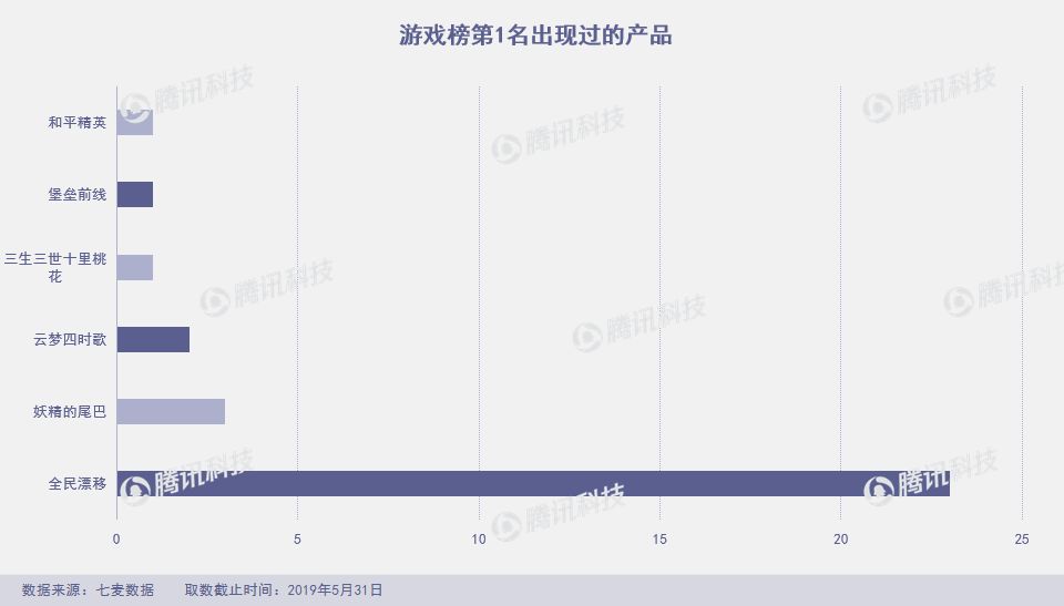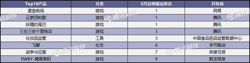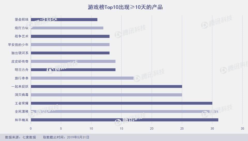 有36款产品出现在5月游戏榜Top 10,腾讯旗下“和平精英”、“王者荣耀”、“一起来捉妖”出现超过20天。