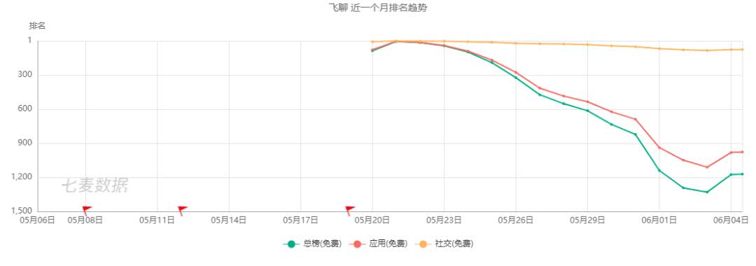 在社交领域,字节跳动旗下产品“飞聊”,自上线后关注度较高,上线后一周内曾在总榜排名第6名、社交榜第1名。但短暂爆火之后数据持续下滑,据七麦数据显示,截至目前,飞聊在总榜排名1000名开外,社交榜排名70多名。