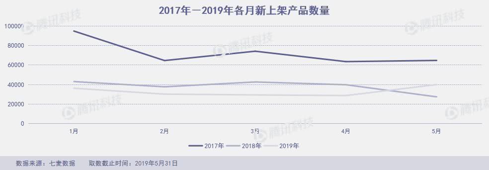 虽然同比2017年5月(6.5万)新上架产品数量下滑38%,但同比2018年5月(2.7万)上涨近46%,同等月份上新数量首次超越2018年。