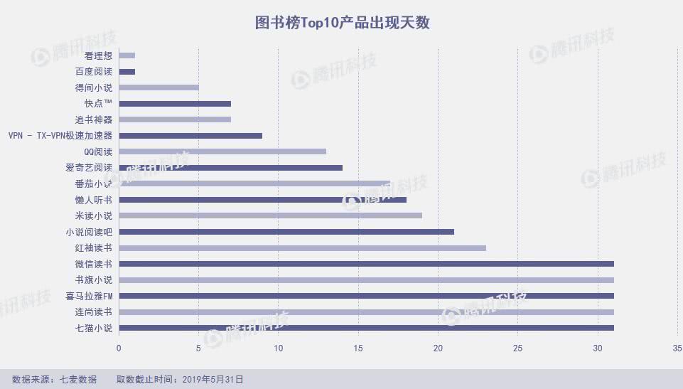5月份,18款产品出现在图书榜Top 10之列。其中,七猫小说、米读小说、番茄小说和连尚读书月活均超过1000万。
