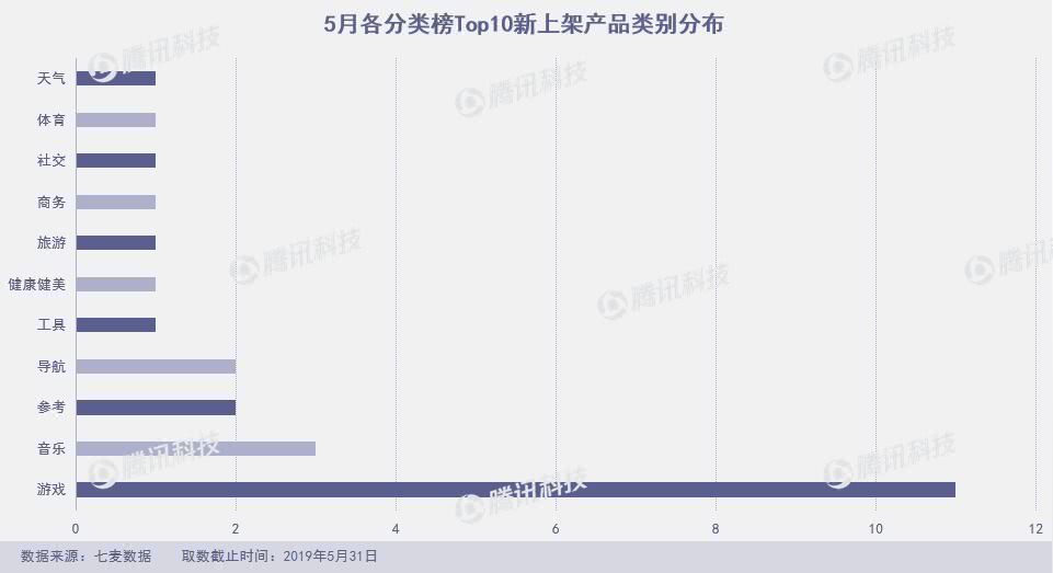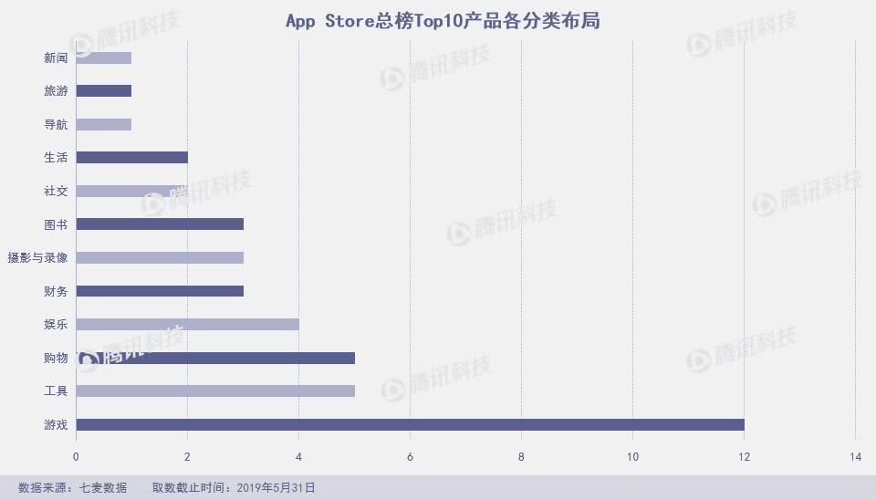 5月份,在总榜Top 10共出现过42款产品,其中,游戏类产品有12款,工具类和购物类分别出现过5款产品。