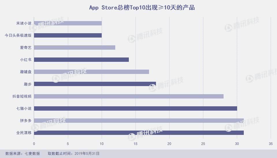 全民漂移、拼多多、七猫小说和抖音短视频占据总榜Top 10超过20天。