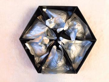 六个粽子,六边形的黑色小食盒,整整齐齐。盒子还能重复利用做零食盘。(第一批90后已经开始收破烂了)