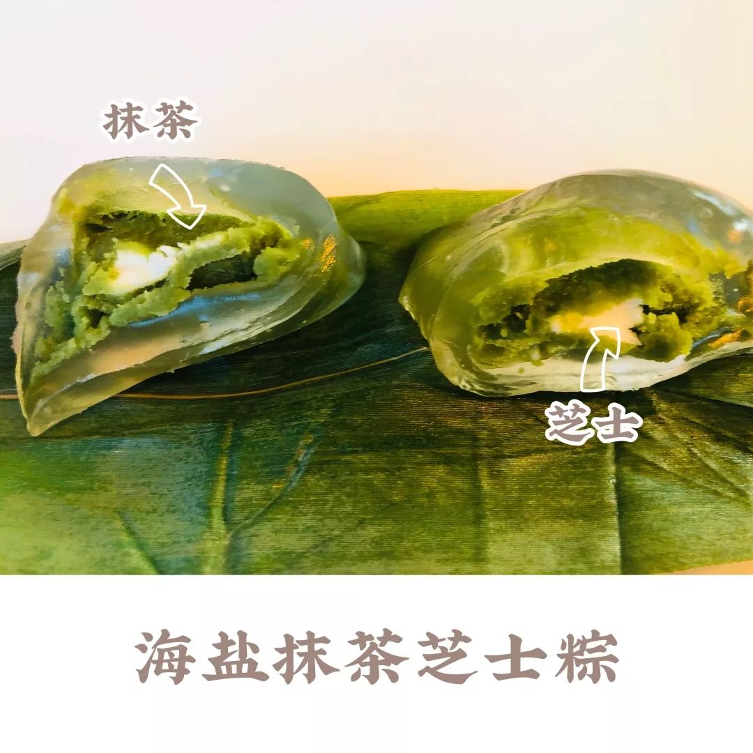 看起来就是绿绿的,快和粽叶融在一起了,切开发现里面还藏着白白的芝士。