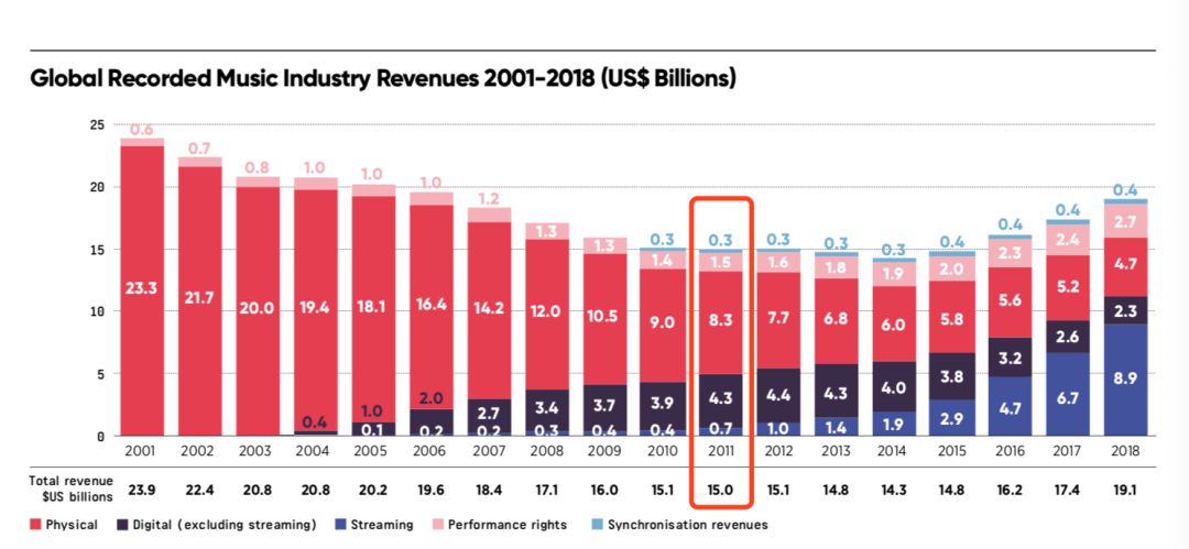 我没有把付费下载列为一个时代,一是因为,我认为付费下载的消费模式并没有发生根本变化,可以属于唱片时代;二是因为,付费下载哪怕在巅峰期也没有取代实体唱片成为全球收入主心骨。