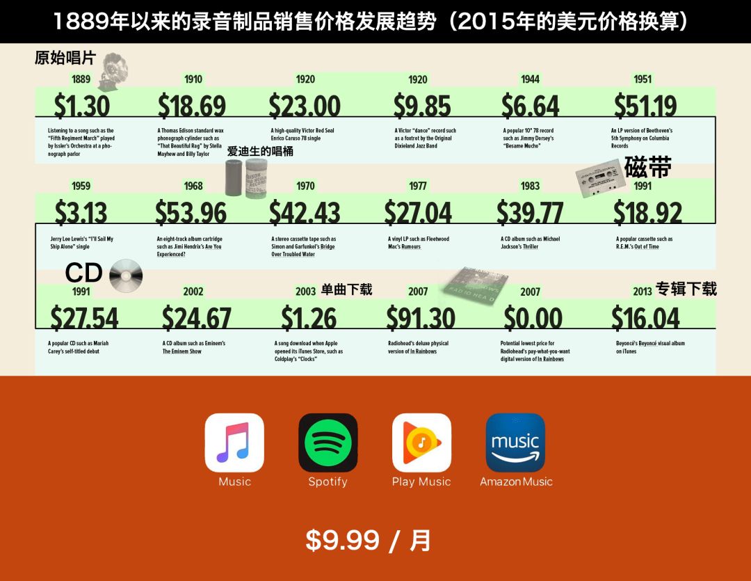 唱片时代就比较好理解了,一个靠卖唱片挣钱的时代,无论唱片载体是黑胶、磁带还是CD,甚至MP3,商业模式并没有本质变化。唱片时代尽管已是强弩之末,但时代仍在继续,我们都身处其中。