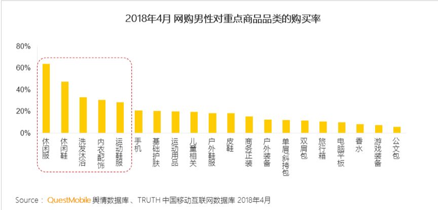 据Quest mobile,除了电子产品,男性在意的物品品类逐渐丰富。与个人形象密切相关的物品,服装、鞋、个护用品是男性购买频率很高的商品品类。