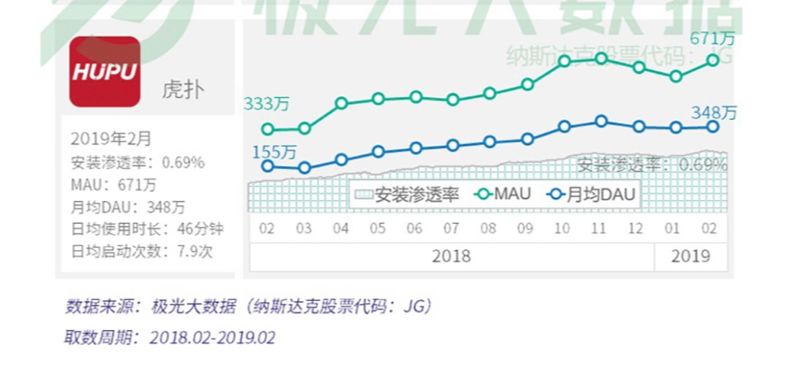 从专业领域来说,虎扑目前仍然拥有其它社区无法比拟的优势。据极光大数据显示,截至2019年2月,虎扑MAU达到671万,日均使用时长46分钟,日均启动次数7.9次。