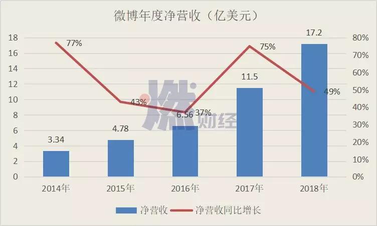 对历年净营收同比增速进行对比,除2017年以外,其余年份均呈现下降趋势。2014年,微博上市当年,净营收同比增速为77%,上市第二年降到43%,2016年进一步降到37%。2017年有短暂回升之后,2018年又降到49%。