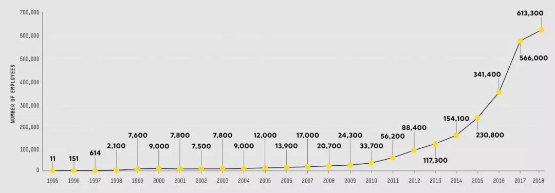 亚马逊1995年至2018年招聘员工数量变化(来源:Fast Company)