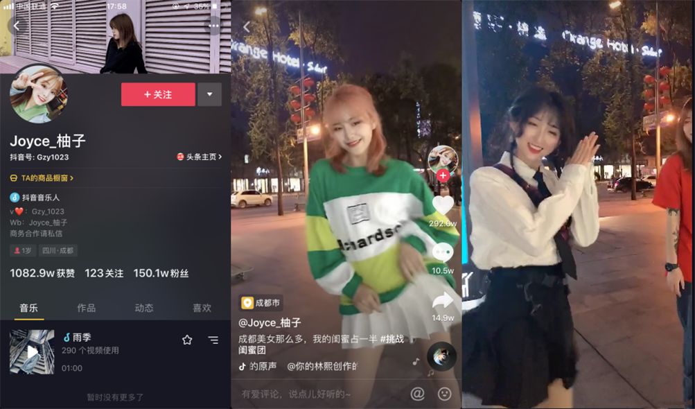 比如“闺蜜团”挑战。3月26日,抖音号@Joyce-柚子,上传了一段名为“成都美女那么多,我的闺蜜占一半”的舞蹈视频。这则视频让她一夜之间涨粉百万。之后几天,闺蜜团其它成员相继发布同款视频,从而在全国范围内掀起闺蜜挑战赛。