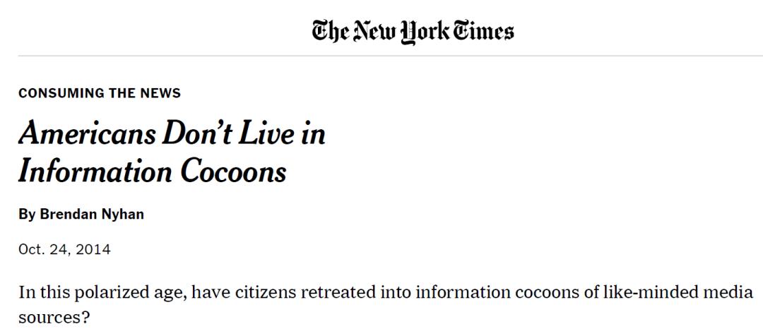 《纽约时报》曾在2014年10月24日刊登一篇文章“Americans Don’t Live in Information Cocoons”(《美国人并没有住在信息茧房中》),文章也承认人们倾向于阅读与自己个人偏好相符的文章(比如政治倾向)。但文章里引用了好几个研究,试图说明信息茧房的现象在现实生活中并不完全成立。