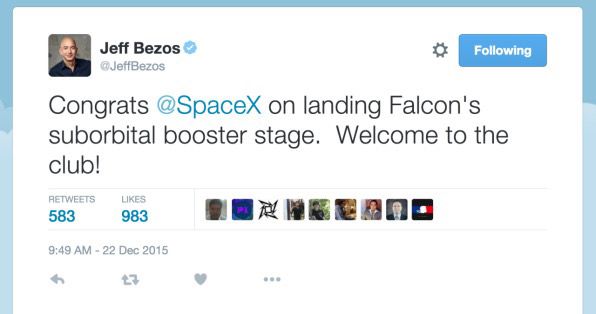 到1个月后,猎鹰9号成功完成软着陆,贝索斯也“大度”地表示了祝贺:
