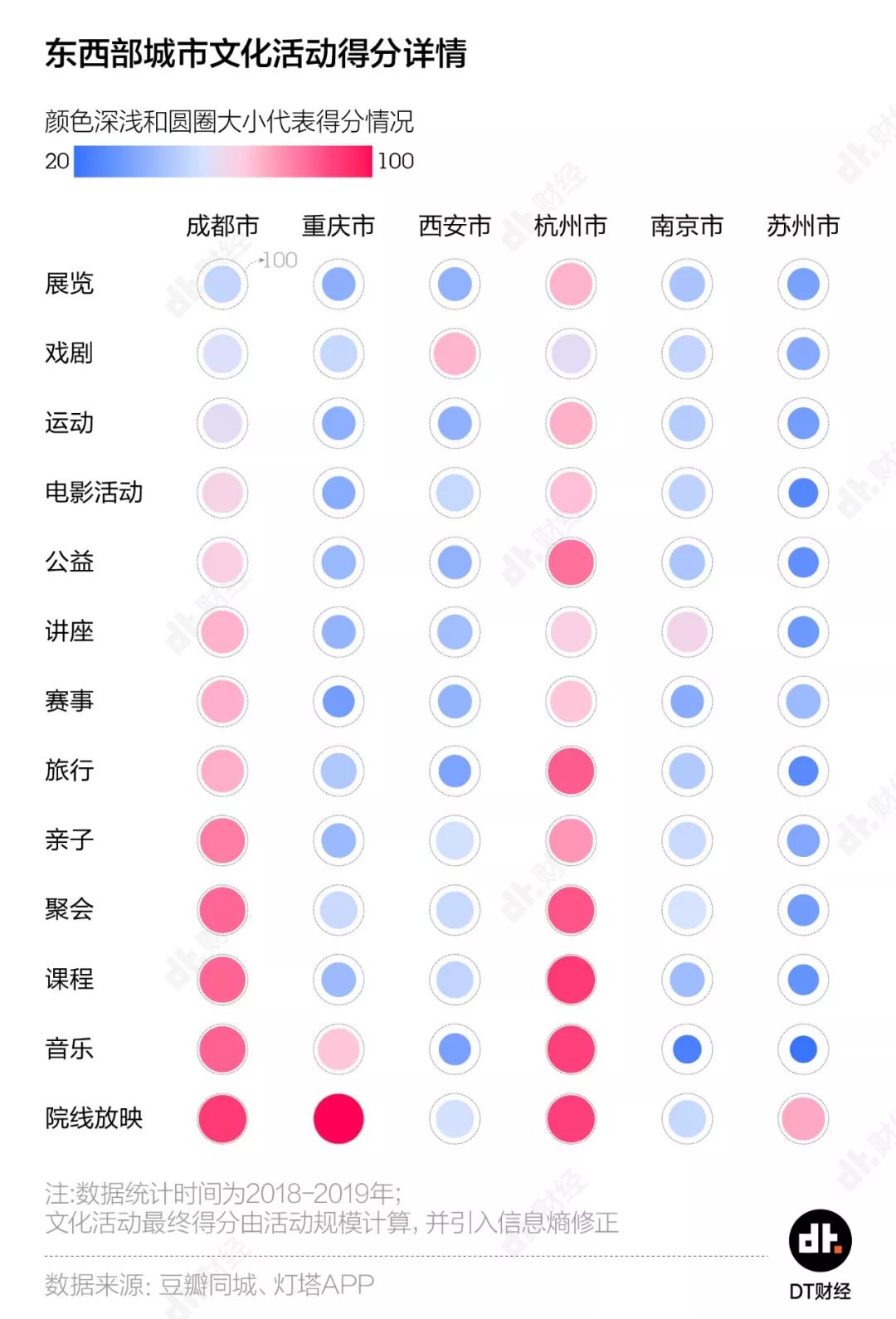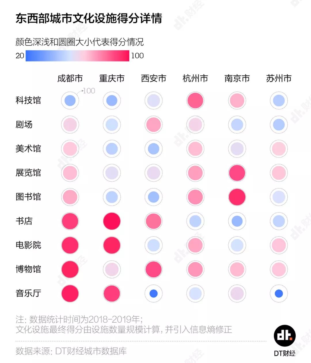 我们发现,东、西部主要二线城市的文化综合实力相差并不大。也就是说,虽然面子光鲜很多,但西部城市的实际文化生活体验并没有比东部更强。