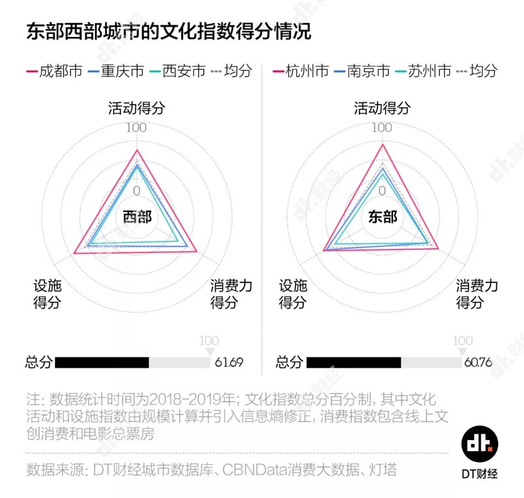 拎出东、西部代表城市展开进一步文化实力PK,这里包括文娱活动指数、文化设施指数和文化消费指数,分别代表城市文化艺术生态中的活动内容、承载基础和群体热情。