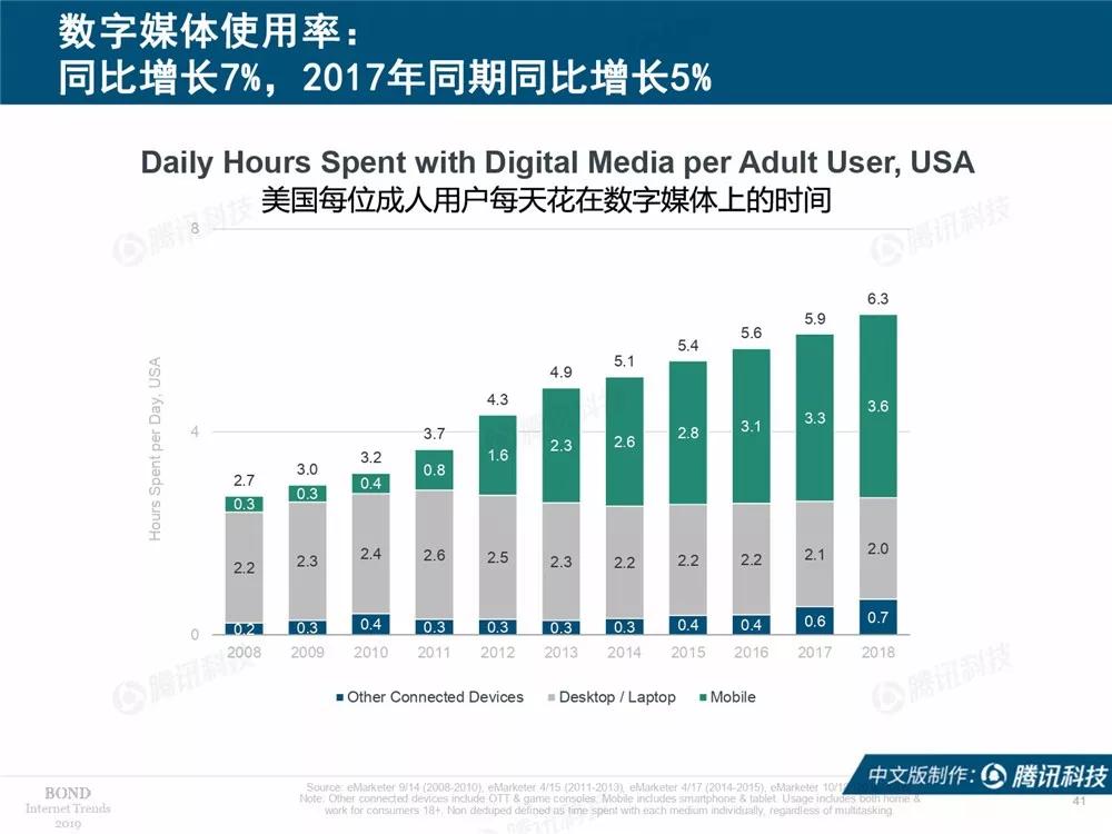 报告以美国为例,2019年,美国人每天在移动端的时间达到了226分钟,首次超过了电视端。