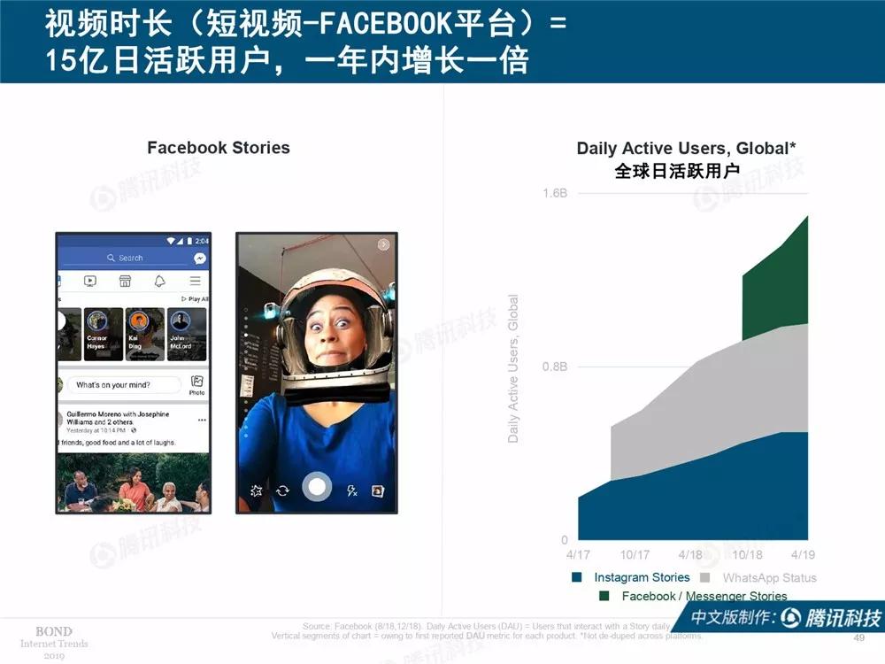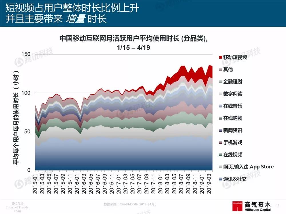 跟往年一样,报告专门用了一个章节,解读中国互联网的发展趋势。报告显示,从2017年4月,到2019年4月,中国短视频APP日均使用时长从不到1亿小时,增长到了6亿小时。